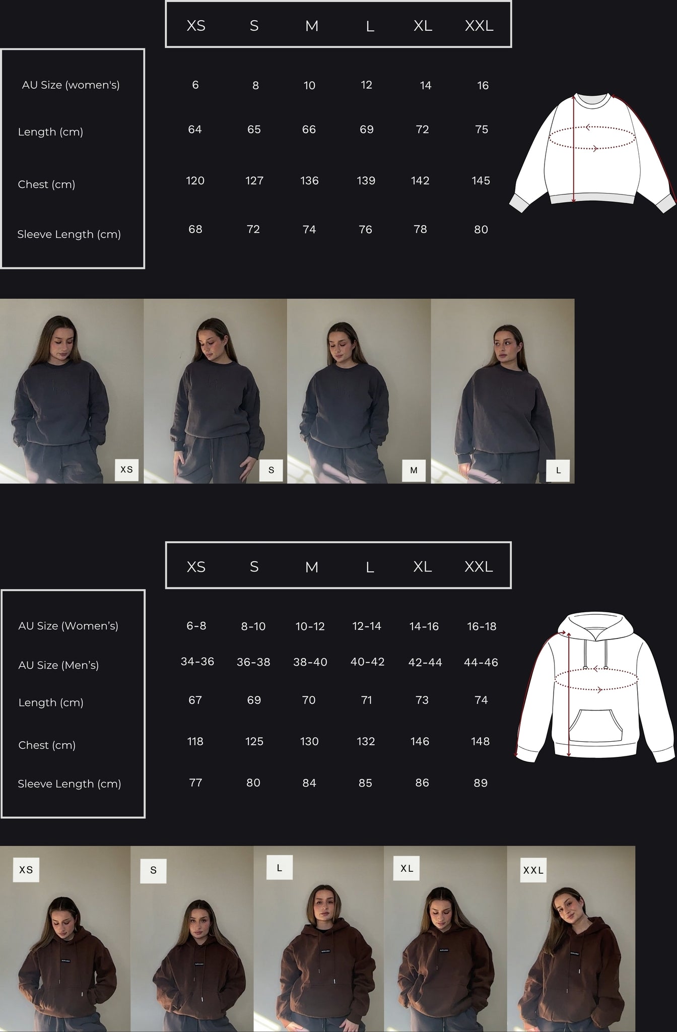 As sizes increase, the main changes are arm length and overall body size. Katie is 165cm AU10 women's in tops. Her favourite is a Large because she loves her clothes that little bit more oversized however, as you can see she fits into all of the sizes currently in stock.