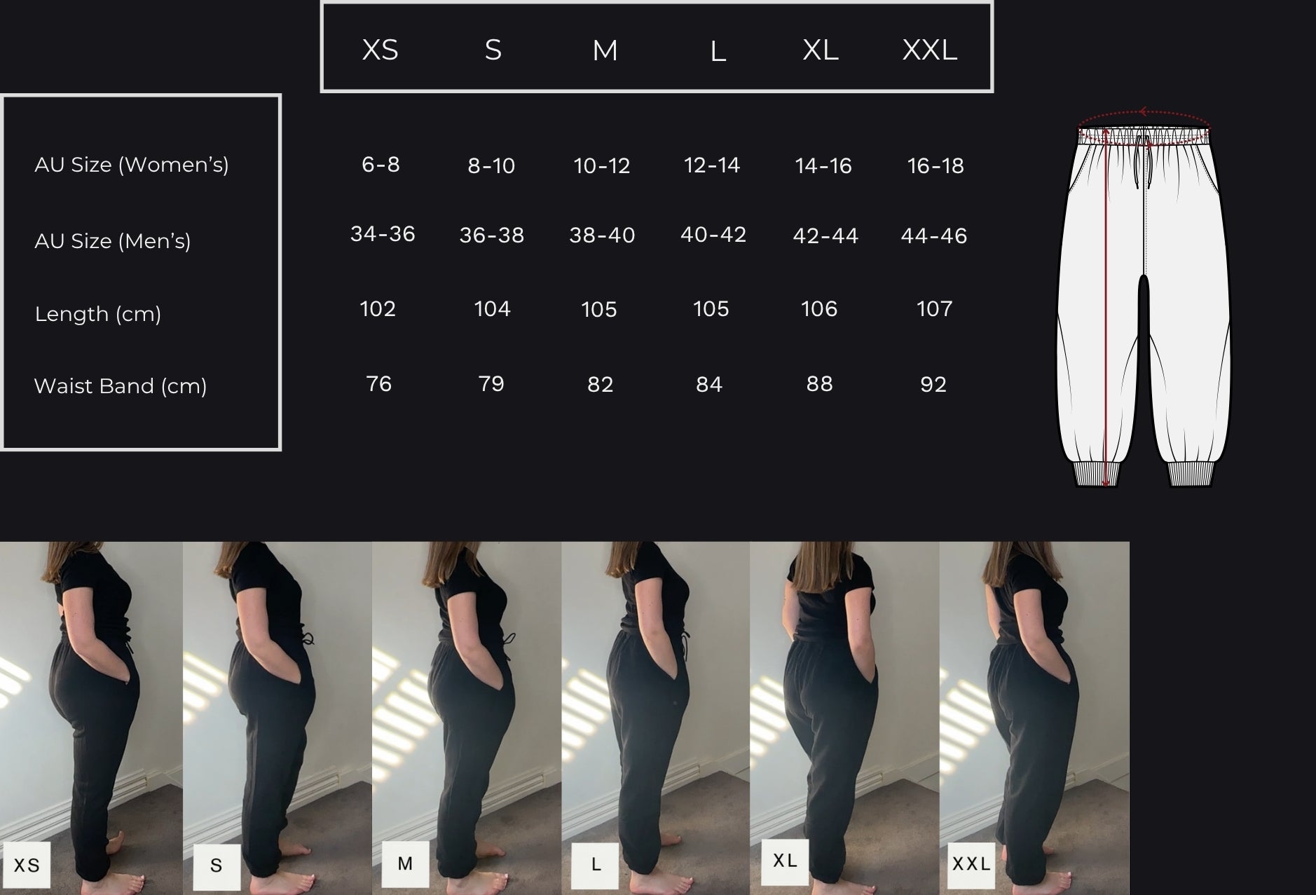 As sizes increase, the main changes are waist and general roominess in the pant. The waistband has high quality elastane to remain snug but you can also tie them up to sinch in/ pull in a bigger pair. As you can see all sizes fit Katie who is 165cm and a size 10 women's in pants however, on XL and XXL she has to tie them. Her preferred size is Large.